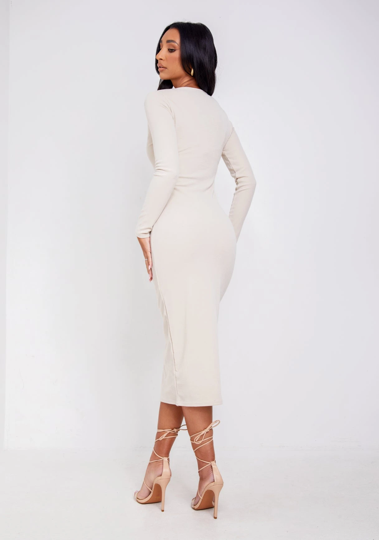 This look has late Summer transitional vibes all over it, babe! Anfisa Beige Ribbed Plunge Midi Dress features beige ribbed material, maxi length, bodycon ‘fit, button through top with rounded neckline and long sleeves.Â