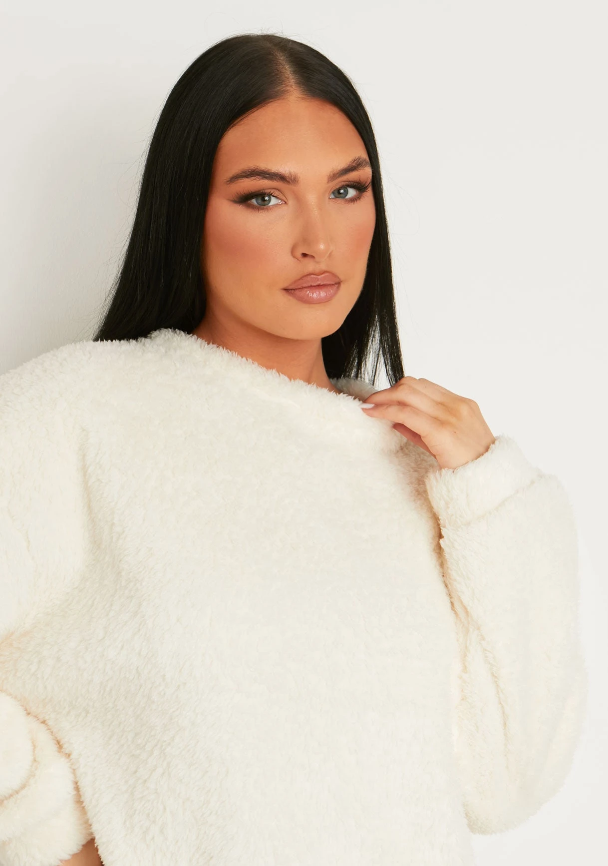 Loungewear is callin! Our Bethany Cream Fluffy Borg V Back Jumper Dress brings all the cute and cosy vibes, a long sleeve jumper dress fitted with a V-back cut out detailing, crew neckline and a super soft fluffy material.