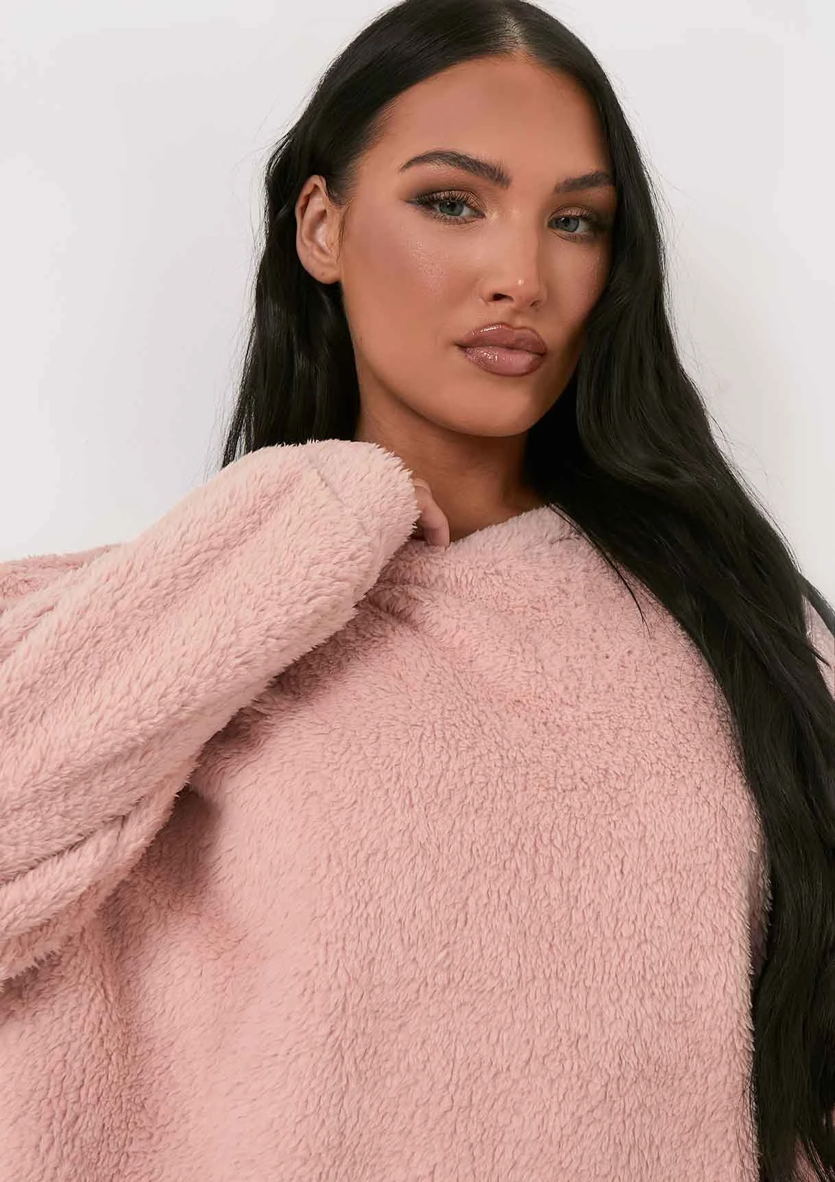 Loungewear is callin! Our Bethany Pink Fluffy Borg V Back Jumper Dress brings all the cute and cosy vibes, a long sleeve jumper dress fitted with a V-back cut out detailing, crew neckline and a super soft fluffy material.
