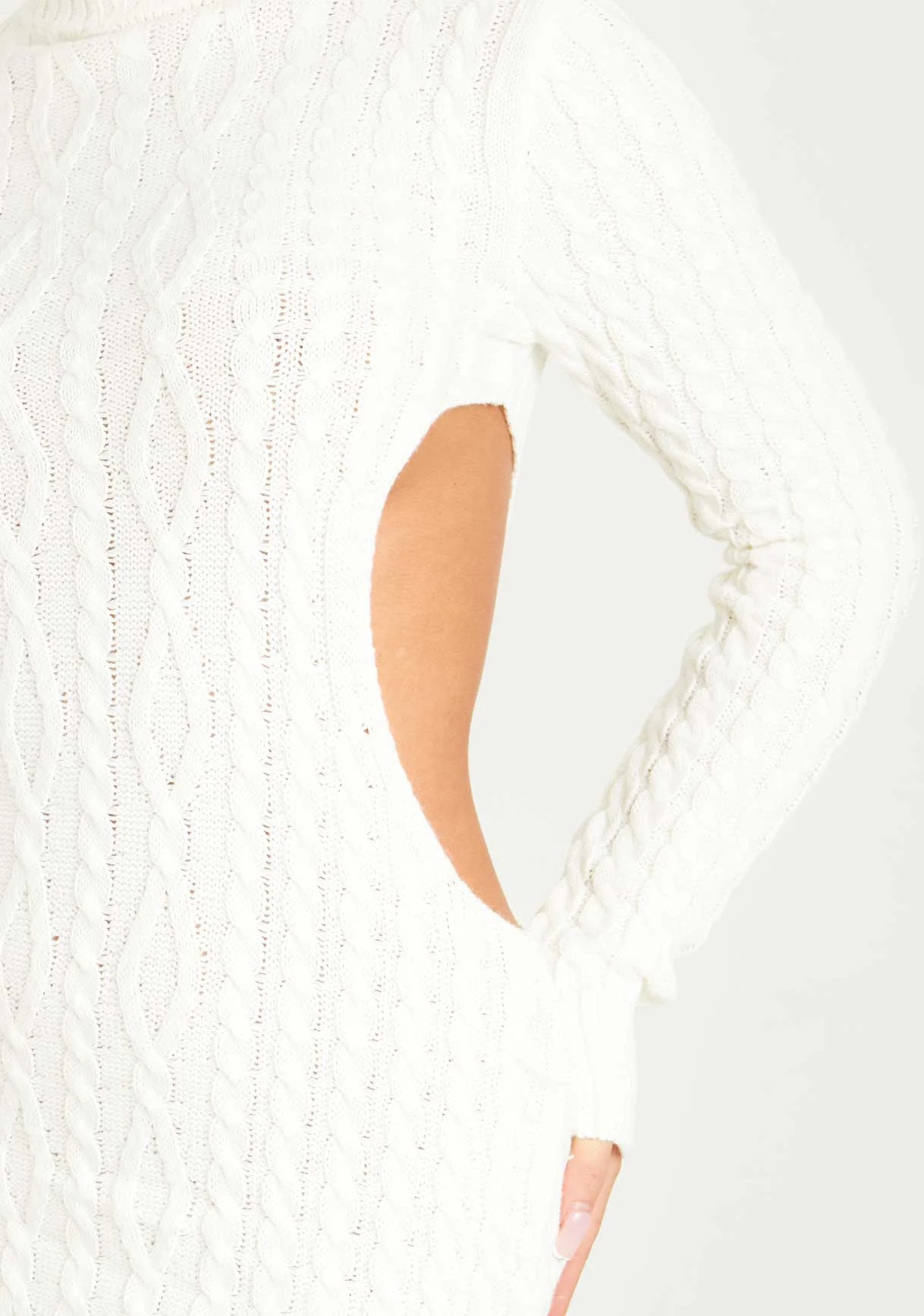 We are loving knit dresses for the new season and this style is at the top of our hit list. Features cable knit design in a cream material, long sleeves, open cut on both sides and bodycon fit to snatch those curves, girl!Â