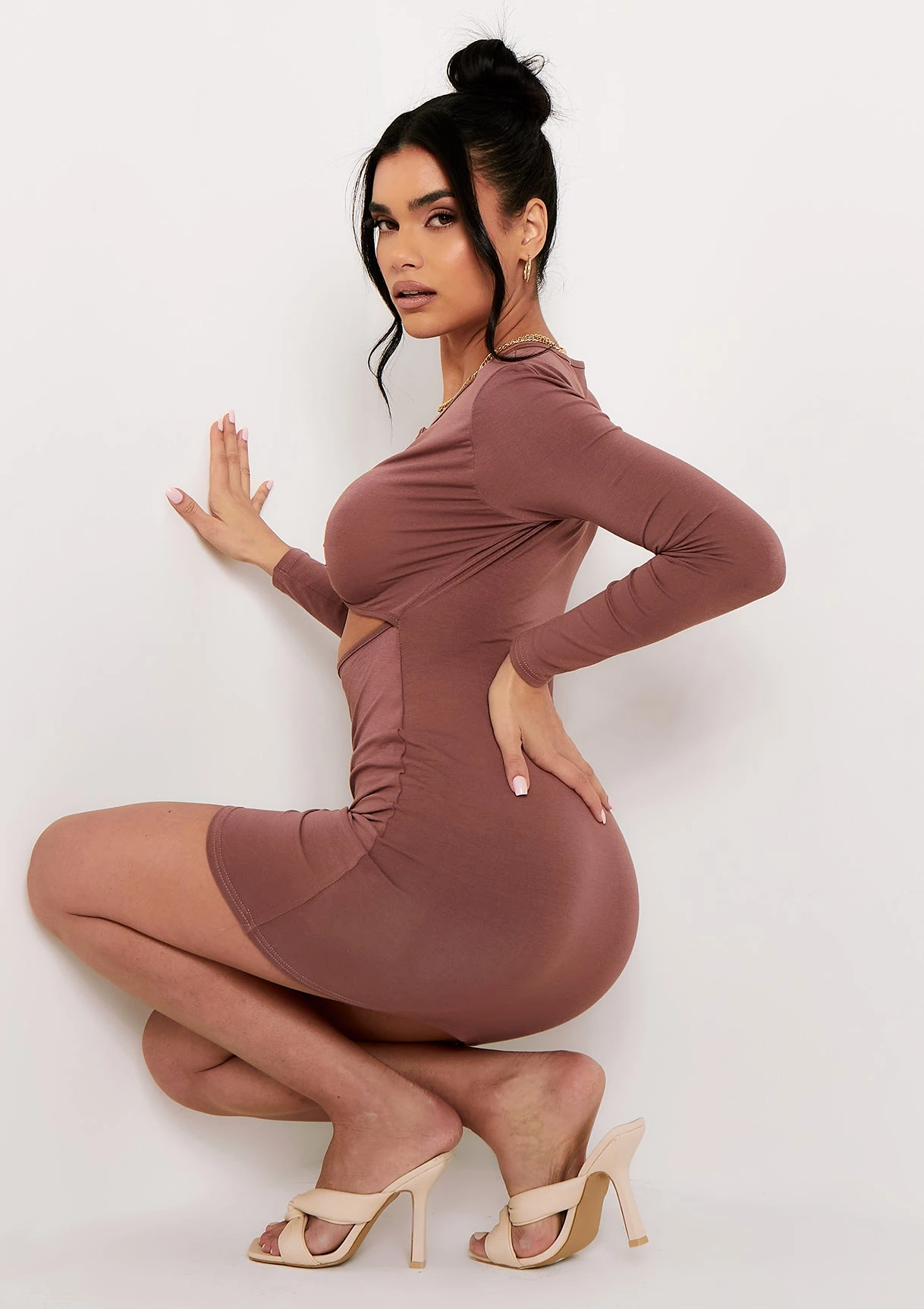 Kill it in our Charlotte Mocha Long Sleeve Knot Front Cut Out Mini Dress, a tight fitting bodycon dress with a mini length, complete with long sleeves, plunge neckline, knot front and cut-out details.
