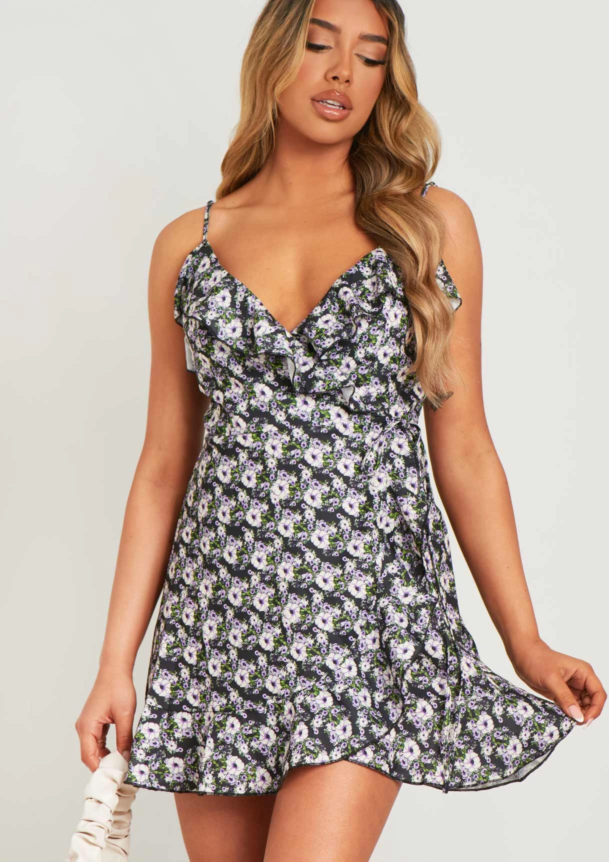 This floral mini dress is sure to give your look a bold update. Our Haila Black Ditsy Floral Frill Wrap Mini Dress features a black ditsy floral material with strappy straps, frill detailing finished in a wrap style!
