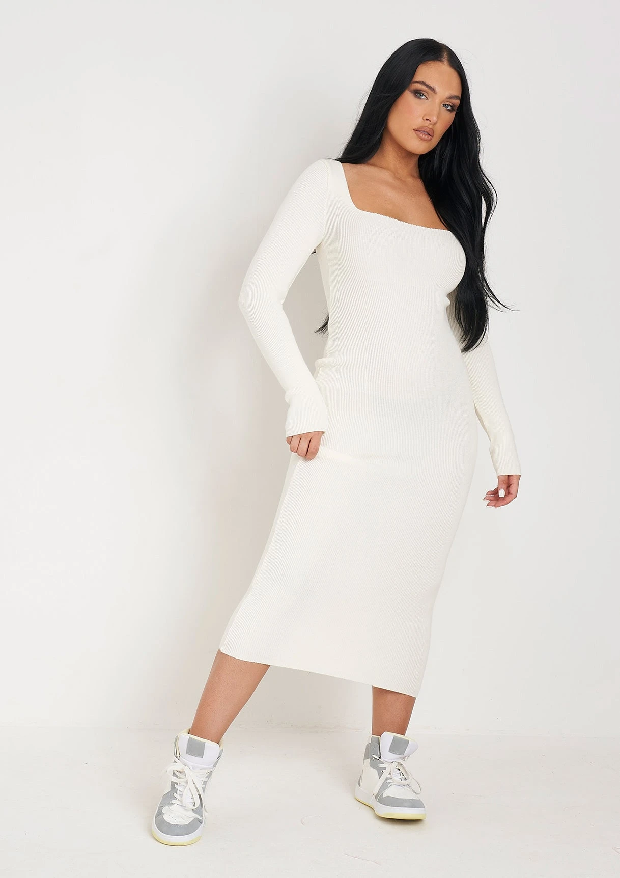 Cream Knit Square Neck Long Sleeve Midi Dress