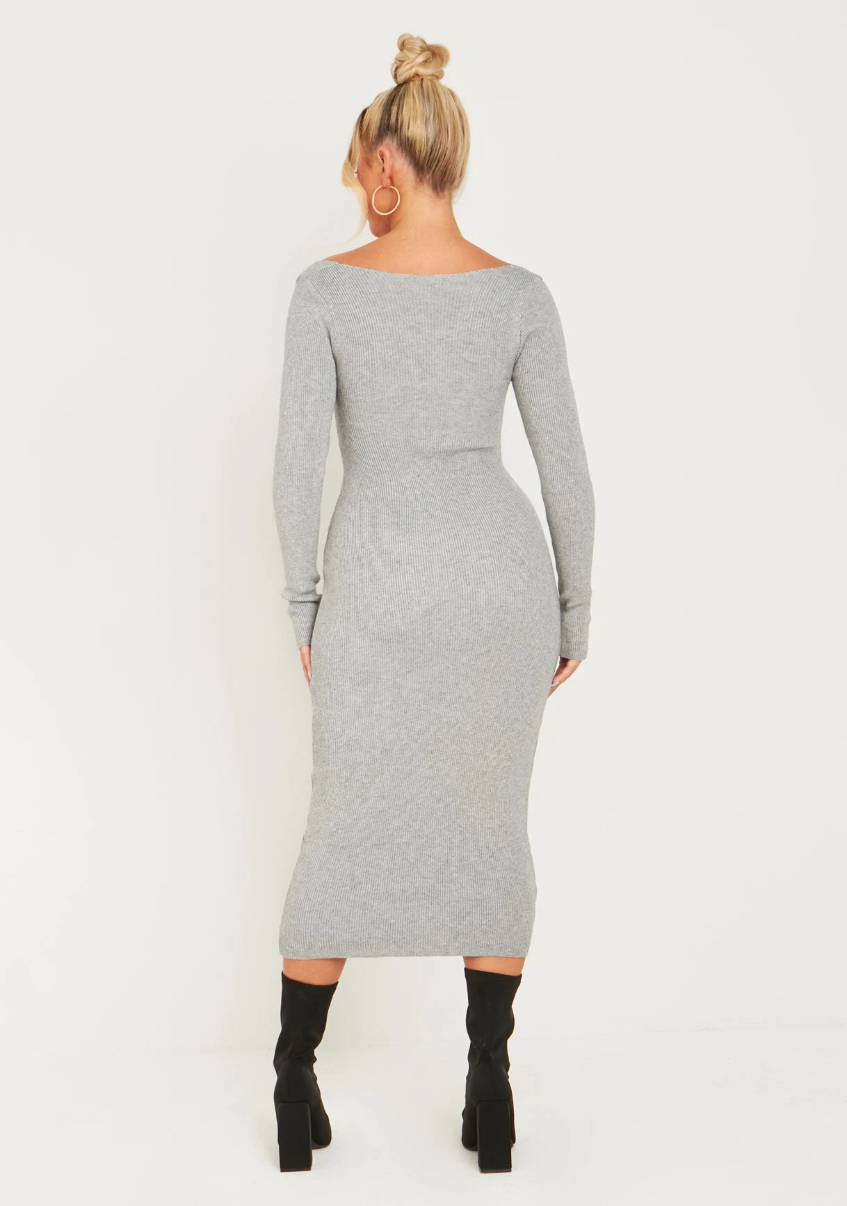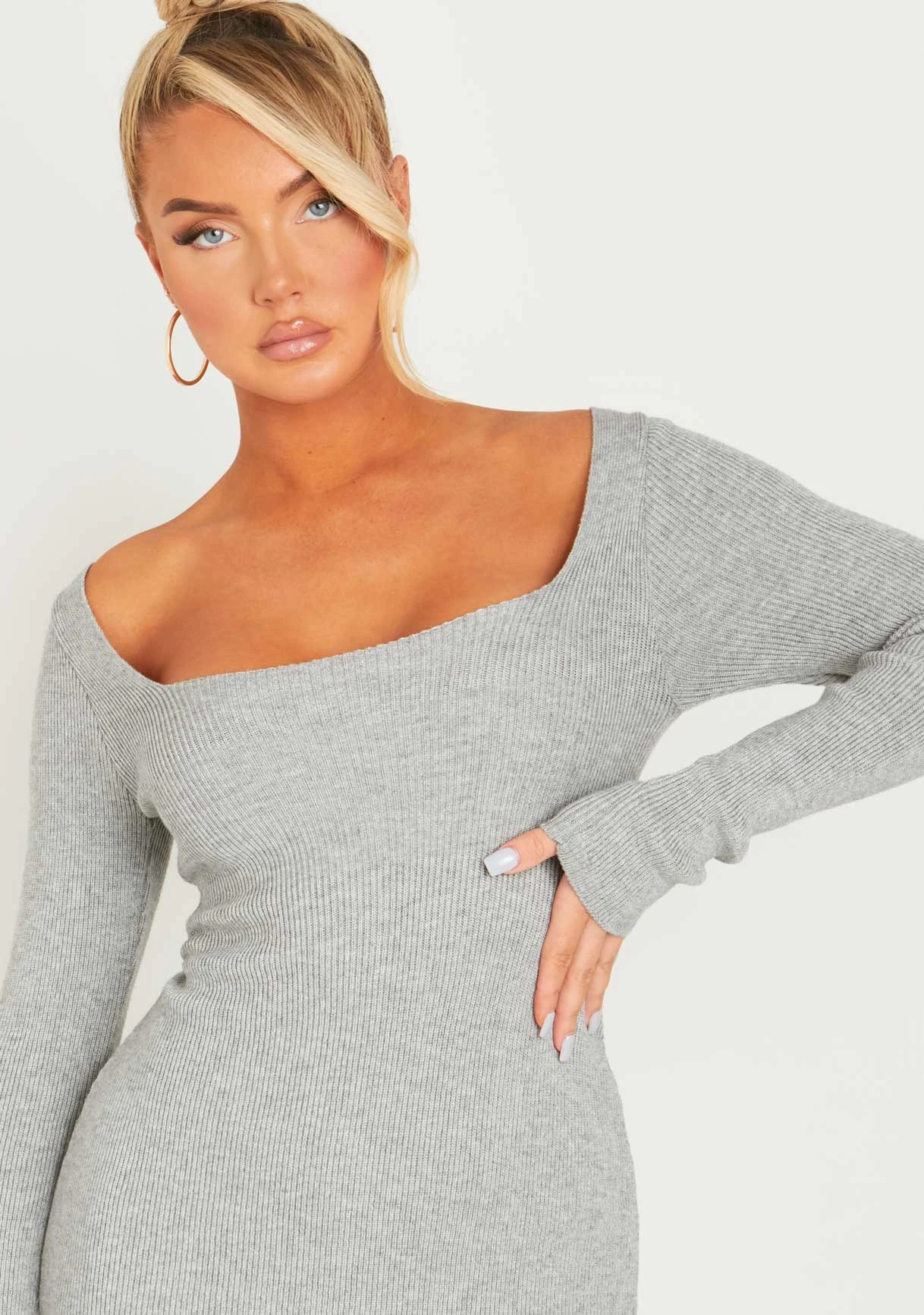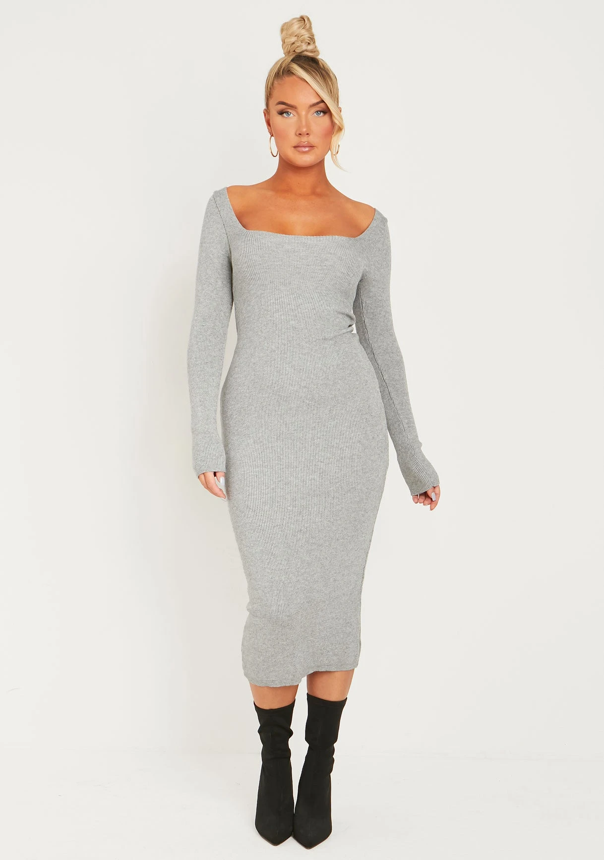 Grey Knit Square Neck Long Sleeve Midi Dress
