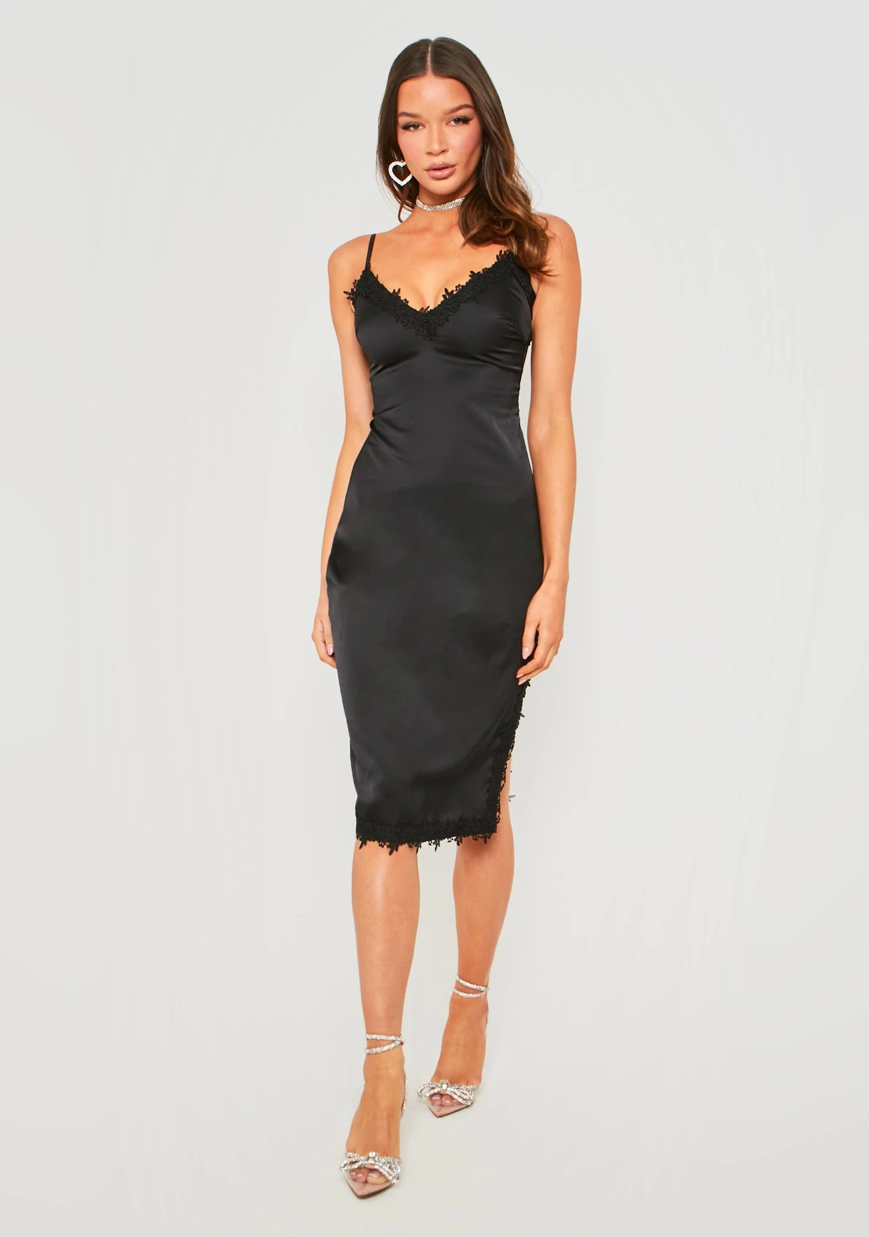 The ultimate classy and sexy look of the year doll. Our Lucie Black Satin Midi Dress With Lace Split features a lace trim and satin material. In a midi length this will be a stunning piece for you date night.