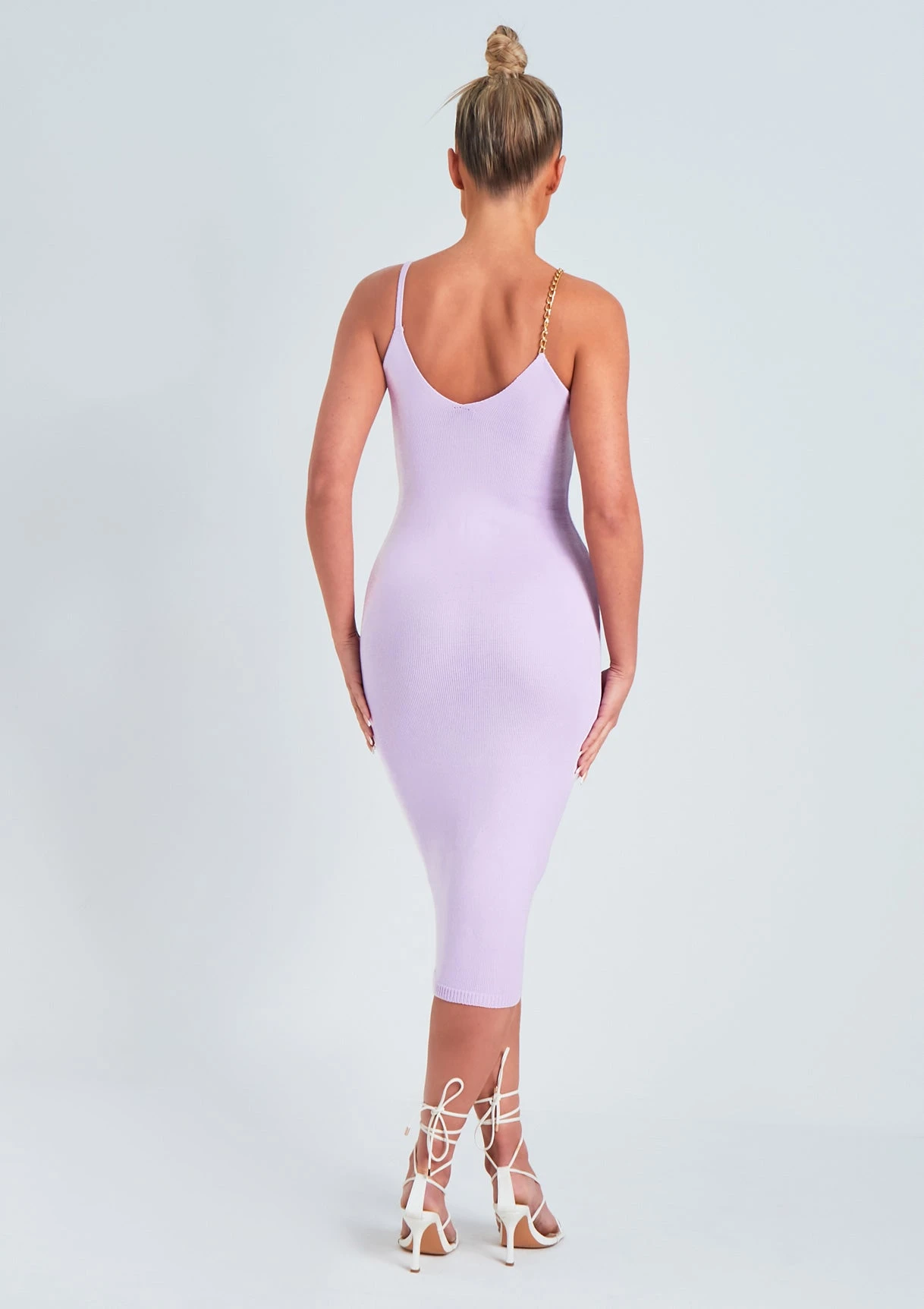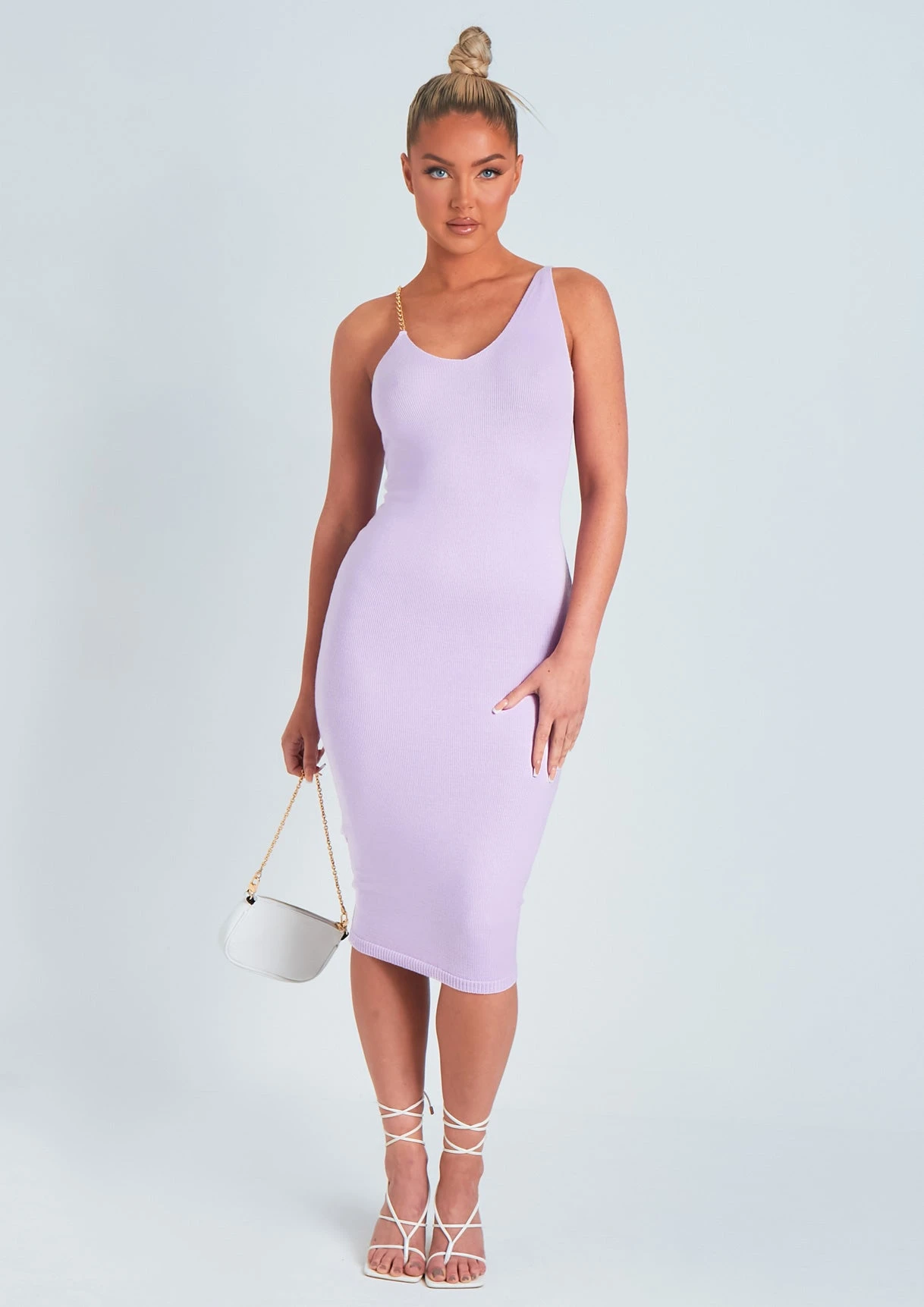 Classy Spring pieces are a must have, our Olivia Lilac Chain Strap Knitted Midi Dress features a chain strap detail in a knitted lilac bodycon fit. Perfect to dress up or make into a casual spring day vibe.