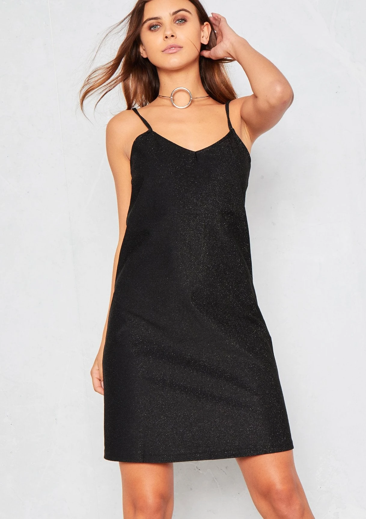 When in doubt add glitter. Look cute as hell in our Valarie Black Glitter Mini Slip Dress, sparkle under the club light this weekend in this black glitter dress in a slip dress silhouette. Style with our Eliotte Black Triple Heels and get ready to sparkle you hot b*tch.